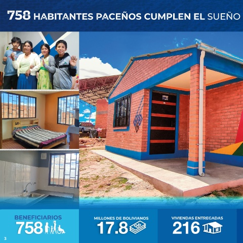 758 HABITANTES PACEÑOS CUMPLEN EL SUEÑO DE TENER VIVIENDAS PROPIAS LA PAZ BENEFICIARIOS MILLONES DE BOLIVIANOS VIVIENDAS ENTREGADAS EMPLEOS DIRECTOS 758 17.8 216 3