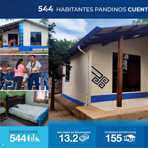 544 HABITANTES PANDINOS CUENTAN CON CASA PROPIA BENEFICIARIOS MILLONES DE BOLIVIANOS VIVIENDAS ENTREGADAS EMPLEOS DIRECTOS 544 13.2 155 5