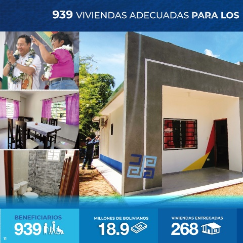 939 VIVIENDAS ADECUADAS PARA LOS HABITANTES CRUCEÑOS BENEFICIARIOS MILLONES DE BOLIVIANOS VIVIENDAS ENTREGADAS EMPLEOS DIRECTOS 939 18.9 268 11