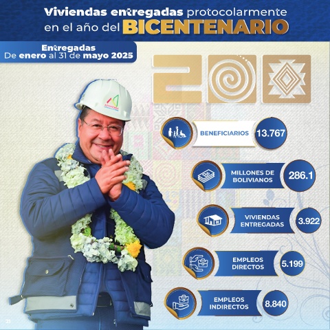 Viviendas entregadas protocolarmente en el año del Entregadas De enero al 31 de mayo 2025 BENEFICIARIOS 13.767 MILLONES DE 286.1 BOLIVIANOS VIVIENDAS ENTREGADAS 3.922 EMPLEOS DIRECTOS 5.199 EMPLEOS INDIRECTOS 8.840 21