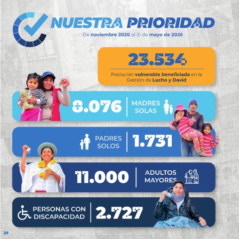 NUESTRA PRIORIDAD De noviembre 2020 al 31 de mayo de 2025 23.534 Población vulnerable beneficiada en la Gestión de Lucho y David 8.076 MADRES SOLAS PADRES 1.731 SOLOS 11.000 MAYORES ADULTOS DISCAPACIDAD 2.727 PERSONAS CON 29