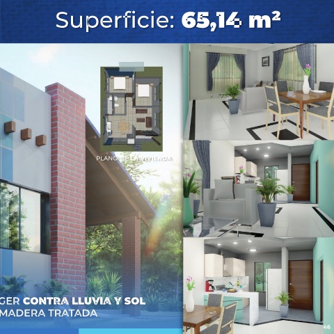 SANTA CRUZ Superficie: 65,14 m² PLANO DE LA VIVIENDA - ACCESO UNIVERSAL Y ARQUITECTURA BIOCLIMÁTICA - TECHOS INCLINADOS CON ALEROS AMPLIOS PARA PROTEGER CONTRA LLUVIA Y SOL - FACHADAS CON MATERIALES MIXTOS COMO LADRILLO Y MADERA TRATADA 46