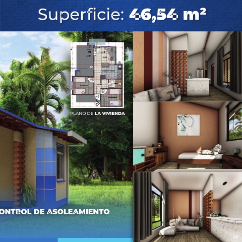 PANDO Superficie: 46,54 m² PLANO DE LA VIVIENDA - ACCESO UNIVERSAL - HALL DE INGRESO CON CELOSÍA DE LADRILLO PARA EL CONTROL DE ASOLEAMIENTO - UTILIZACIÓN DE ARQUITECTURA BIOCLIMÁTICA - JARDINES PERIMETRALES CON VEGETACIÓN NATIVA 48