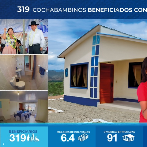 319 COCHABAMBINOS BENEFICIADOS CON VIVIENDAS ADECUADAS COCHABAMBA BENEFICIARIOS MILLONES DE BOLIVIANOS VIVIENDAS ENTREGADAS EMPLEOS DIRECTOS 319 6.4 91 1