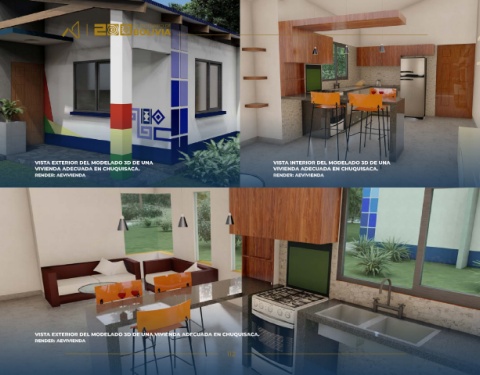 VISTA EXTERIOR DEL MODELADO 3D DE UNA VIVIENDA ADECUADA EN CHUQUISACA.