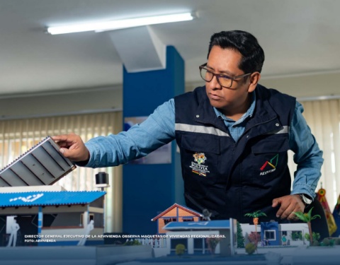 DIRECTOR GENERAL EJECUTIVO DE LA AEVIVIENDA OBSERVA MAQUETAS DE VIVIENDAS REGIONALIZADAS. FOTO: AEVIVIENDA