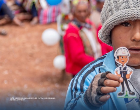 NIÑO MOSTRANDO UNA CASITA DE PAPEL, COCHABAMBA. RENDER: AEVIVIENDA