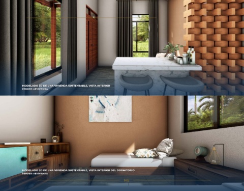 MODELADO 3D DE UNA VIVIENDA SUSTENTABLE, VISTA INTERIOR RENDER: AEVIVIENDA MODELADO 3D DE UNA VIVIENDA SUSTENTABLE, VISTA INTERIOR DEL DORMITORIO RENDER: AEVIVIENDA 145