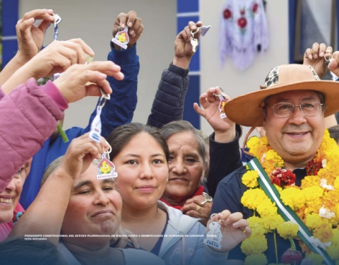 PRESIDENTE CONSTIRUCIONAL DEL ESTADO PLURINACIONAL DE BOLIVIA JUNTO A BENEFICIARIOS DE VIVIENDAS EN CARAPARI - TARIJA. FOTO: AEVIVIENDA