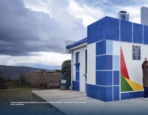FAMILIA BENEFICIARIA FRENTE A LA FACHADA DE SU VIVIENDA - MUNICIPIO TURCO, ORURO. FOTO: AEVIVIENDA