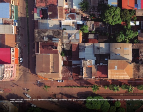 VISTA AÉREA DE VIVIENDAS EN EL DEPARTAMENTO DE BENI, CONTEXTO EN EL QUE CONTRASTA Y RESALTA EL DISEÑO REGIONALIZADO DE LAS VIVIENDAS ADECUADAS EXPUESTAS EN LAS SIGUIENTES PÁGINAS.